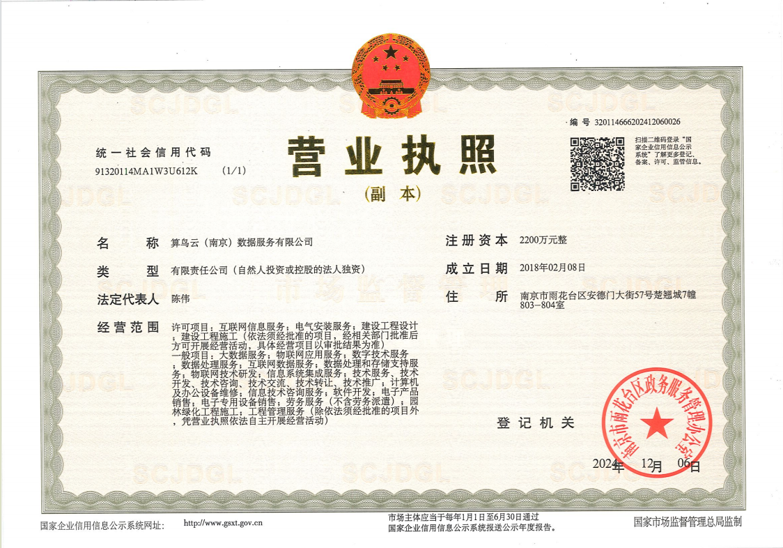 新立訊科技集團全資子公司 “南京新立訊物聯(lián)網(wǎng)技術服務有限公司”經(jīng)國家市場監(jiān)督管理總局核準,南京市市場監(jiān)督管局登記備案,正式更名為“算鳥云(南京)數(shù)據(jù)服務有限公司”。