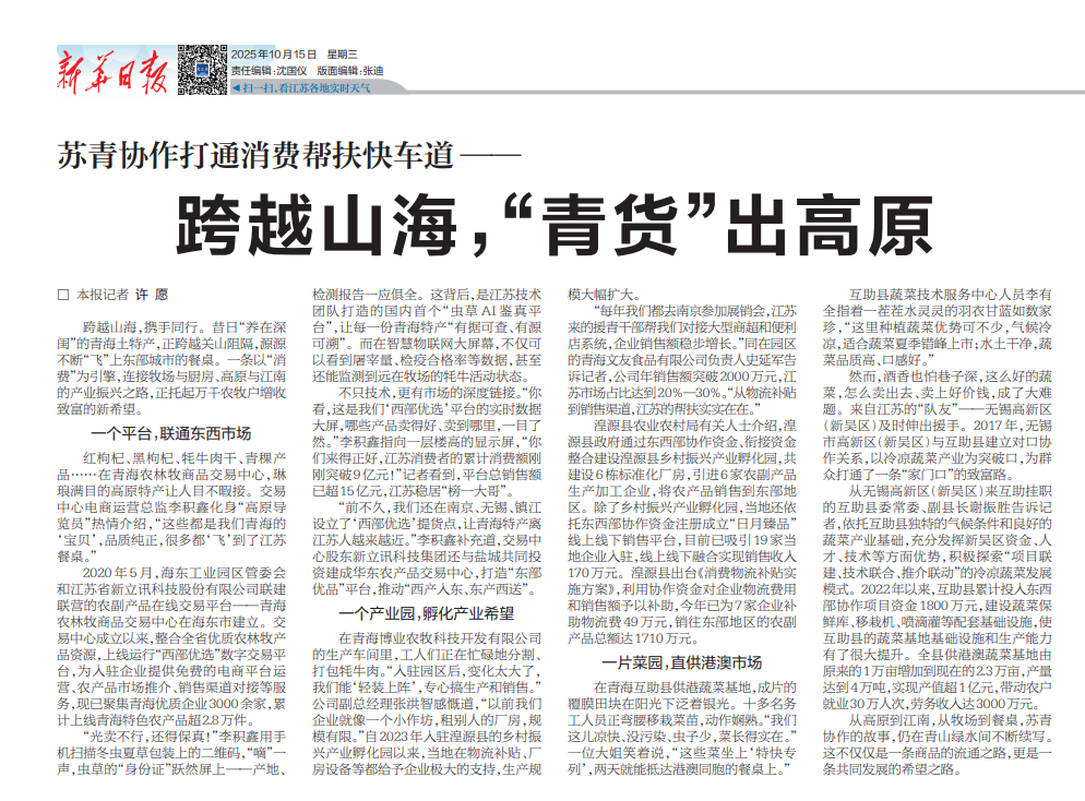 “前不久,我們還在南京、無錫、鎮(zhèn)江設(shè)立了‘西部優(yōu)選’提貨點(diǎn),讓青海特產(chǎn)離江蘇人越來越近。”李積鑫補(bǔ)充道,交易中心股東新立訊科技集團(tuán)還與鹽城共同投資建成華東農(nóng)產(chǎn)品交易中心,打造“東部優(yōu)品”平臺,推動“西產(chǎn)入東、東產(chǎn)西送”。