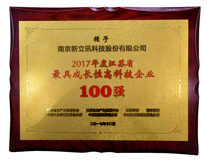 2017年江蘇省“最具成長性高科技企業”評選活動于2017年12月1日完成。組委會通過對企業各項技術評審、答辯考察評審等程序,遴選出100家創新實力強,成長速度快的科技型企業。對此類企業給予相關科技、金融信貸等優惠政策,推動企業更快更好優化發展。新立訊秉持科技創新、引領時代的工作宗旨和發展觀念,在此次評選中贏得了組委會的高度認可,成為2017年江蘇省“最具成長性高科技企業”百強之一。