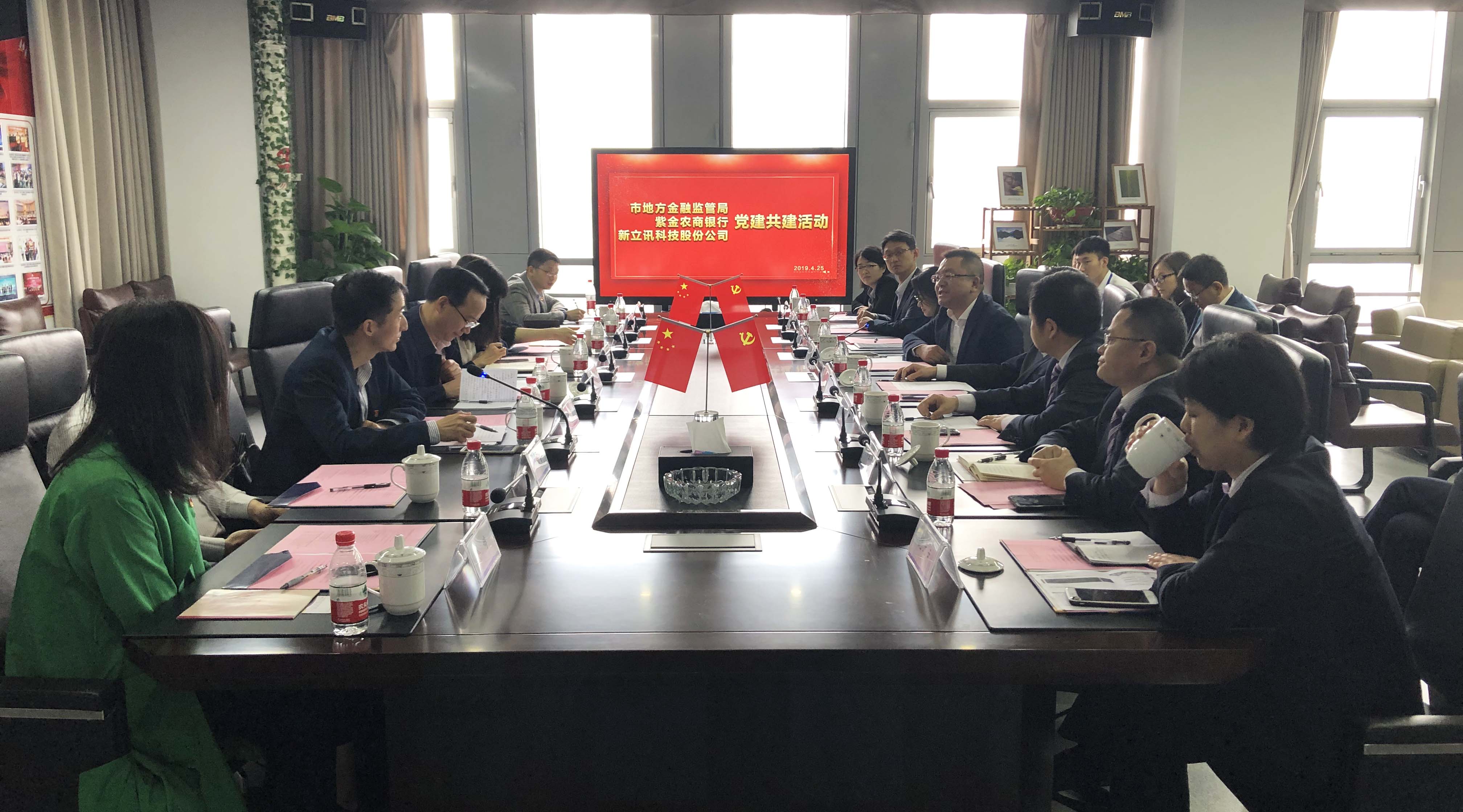 2019年4月25日,南京市地方金融監(jiān)管局、紫金農(nóng)商銀行與南京新立訊科技股份有限公司共同在新立訊總部開(kāi)展黨建共建活動(dòng)。金融監(jiān)管局黨組書(shū)記、局長(zhǎng)劉永彪,紫金農(nóng)商銀行黨委副書(shū)記王留平;中國(guó)(南京)軟件谷高新局局長(zhǎng)吳瑩;新立訊董事長(zhǎng)毛霖、公司高管層及各方黨員代表等共同參與此次黨建活動(dòng)。共建活動(dòng)由新立訊黨支部書(shū)記、副總經(jīng)理李偉主持。