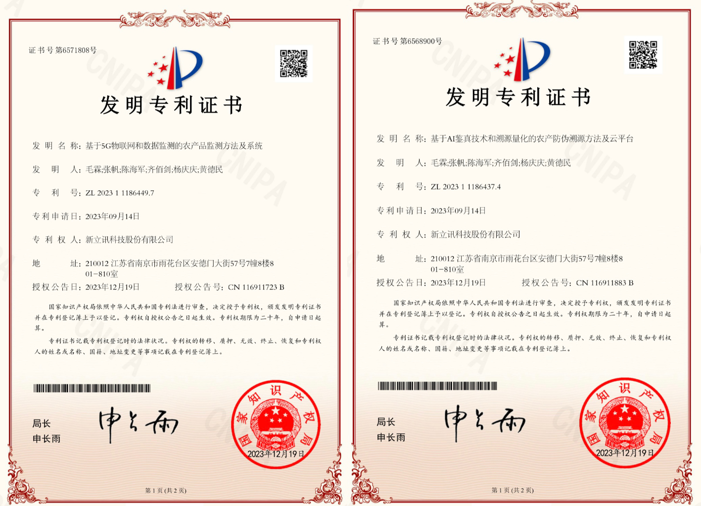 四項發明專利分別是:基于5G物聯網和數據監測的農產品監測方法及系統(CN116911723B),基于AI鑒真技術和溯源量化的農產防偽溯源方法及云平臺(CN116911883B),農產品基礎數據資源池管理方法及系統(CN117032906B),一種農產品交易數據處理方法、裝置、服務器及存儲介質(CN117057825B)。四項發明專利均為原始取得。