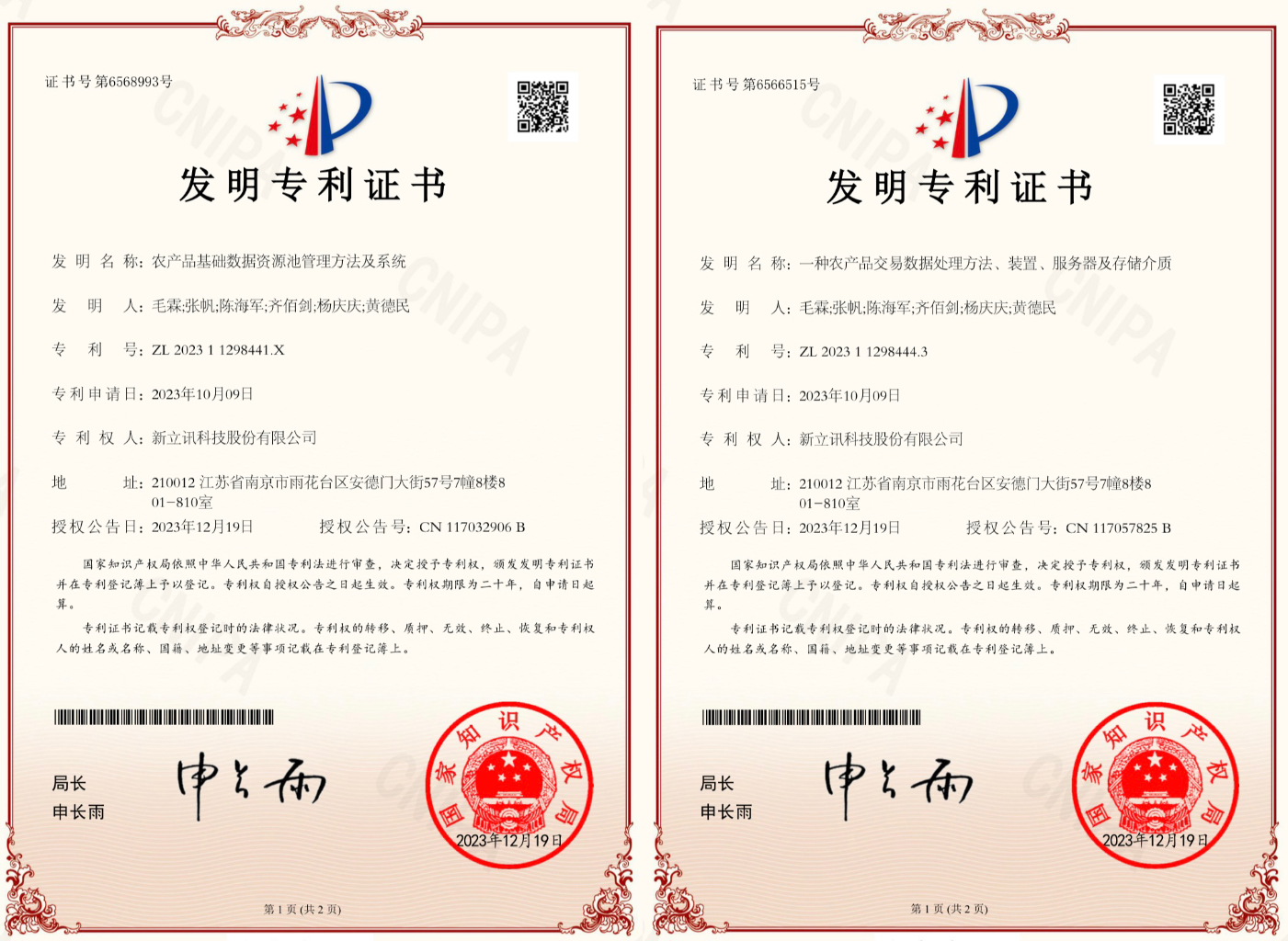 2023年12月,新立訊在農產數據交易領域再獲4項發明專利。發明專利涵蓋了農產數據交易與防偽鑒真多個方面,包括數據采集、處理、分析和應用等,將有效提高農產交易數據效率和可持續性。